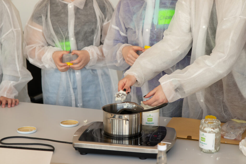 Doch zuvor wurden die Teilnehmerinnen mit Schutzkitteln und -brillen ausgestattet, damit Augen und Kleidung vor Spritzern geschützt sind. Nach Erhitzen, Mischen und Abfüllen, musste nur noch abgewartet werden, bis die cremige Masse aushärtet. Die Eigenkreation aus verschiedenen Bio-Ölen und Shea-Butter, durfte natürlich mit nach Hause genommen werden, ebenso wie Kugelschreiber, Blöcke, eine Schutzweste und ein Lanyard -natürlich in Häffner-Grün!